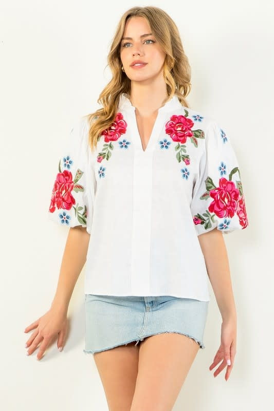 Sophia Embroidered Chenille Floral Puff Sleeve Top