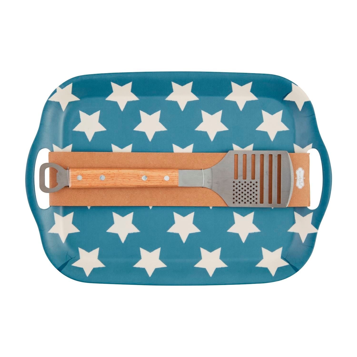 Bamboo fiber serving tray with side handles. Comes with American flag spatula with bottle opener handle.