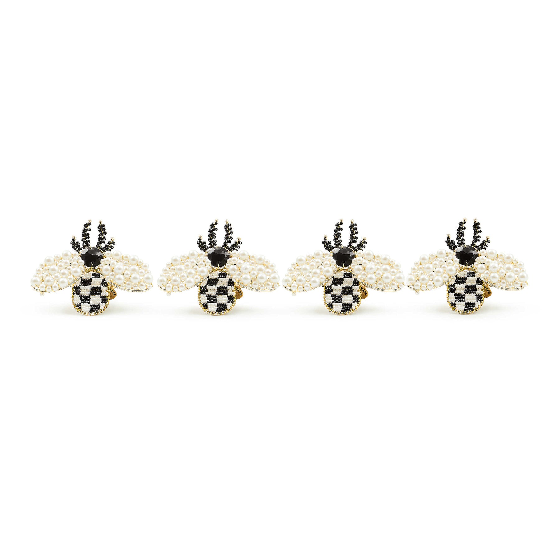 Buzzing about this set of four bee napkin rings, each ring features beads and glass pearls on a frame of iron and brass.