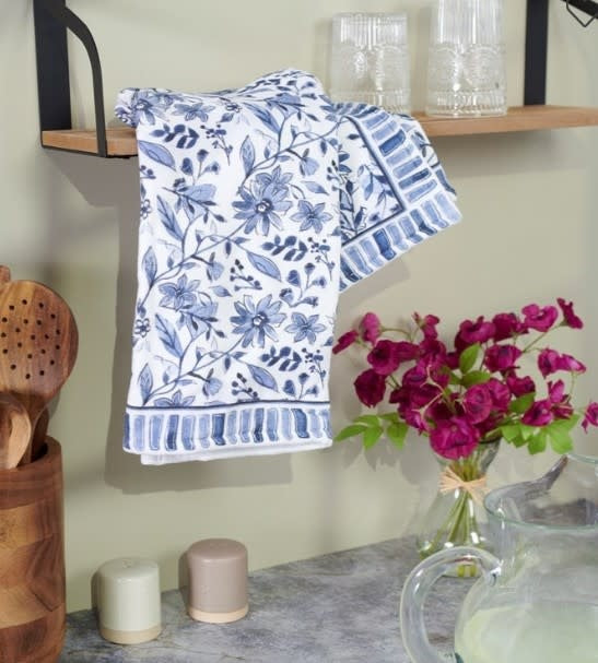 A cotton kitchen towel displaying an all-over design of chinoiserie inspired blue florals replicated from original art hand painted in a unique watercolor style. Floral kitchen towel features a terrycloth layer on the back for added absorbency and cotton tape loop for hanging. Our Blue Florals kitchen towel is conveniently machine-washable for easy cleaning. Indigo kitchen towel is packaged on a cardboard hanger with hole to easily display on rack. A floral-themed kitchen accessory perfect for everyday use.