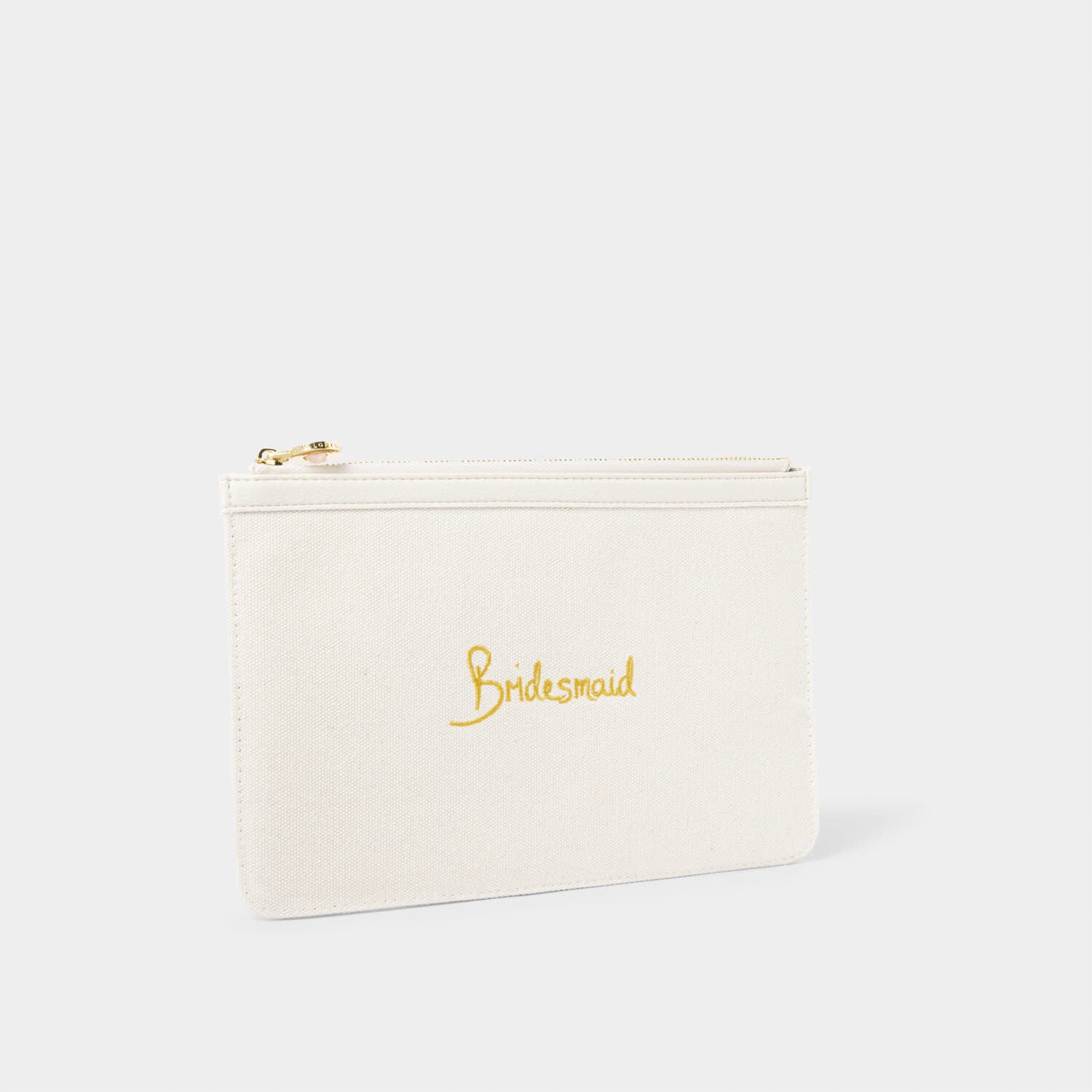 The must-have accessory for summer weddings this season, our Bridal Canvas Pouch features a brand-new lightweight canvas material, and a sparkling semi-precious stone zip pull. Complete with the golden embroidered sentiment 'Bridesmaid', helping your bridal party to walk down the aisle in the most stylish way imaginable.