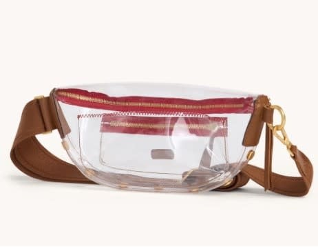 This updated take on our internet famous belt bag embraces the crossbody styling our fans have come to love, with size inclusivity in mind and a clear, stadium-approved twist. Plus, its long strap allows you to truly wear this style as a low slung crossbody, in addition to over your chest. Adorned with a hint of our signature soft pebbled leather with a hint of shine featuring a warm medium brown hue, brushed gold hardware and red zipper combo, this pairing will have you celebrating in the end zone.