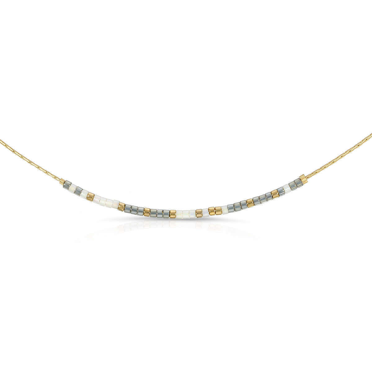 - The message is encoded using pearl white and gold-flecked gray glass beads.