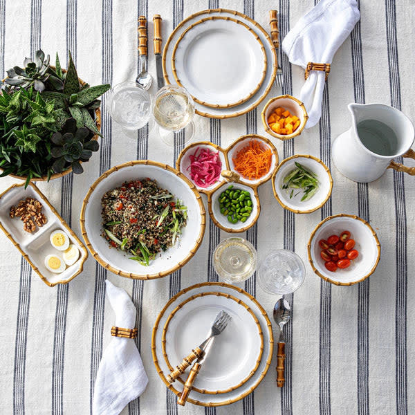 A modern serving bowl encircled with a traditional bamboo rim. This piece is a chic addition to any decor.