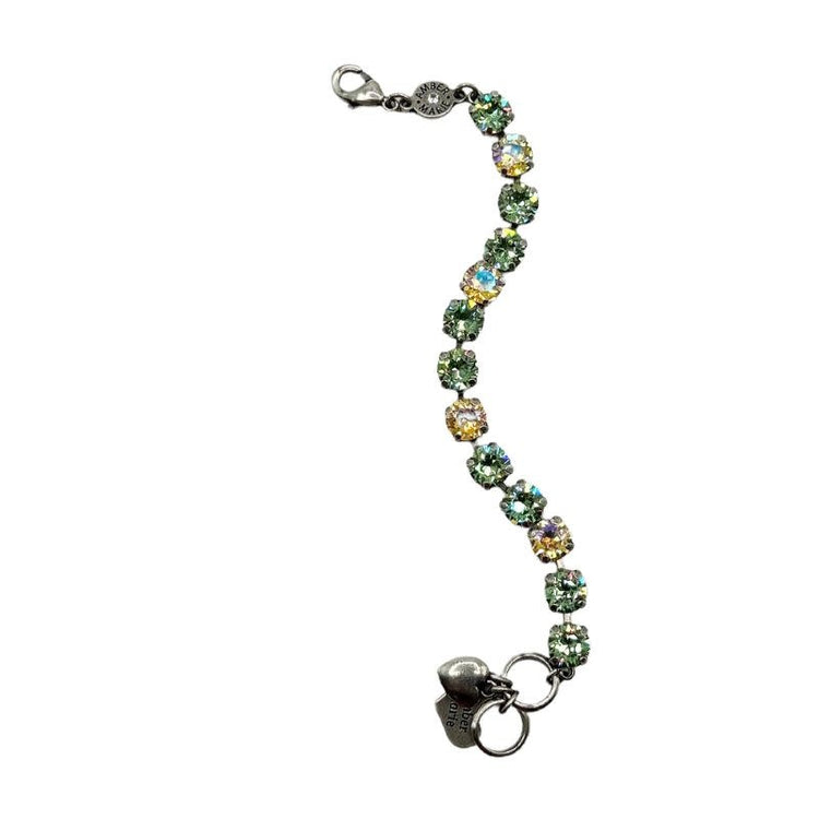 Inspired by Dublin, this collection of Jere Bijoux is a beautiful collage of greens.  This is our classic best selling bracelet.  15, 39ss stones with an adorable Amber Marie Tag adorned with a special crystal.  Note the Scotty dog heart charm!  Bracelet can extend to 8.25" and as short as 7.5" Each bracelet is assembled in the USA with Czech Crystals and the settings are made in Israel.