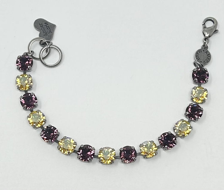 Inspired by a Fun New Orleans Mardi Gras, this collection of Jere Bijoux is a beautiful collage of greens, yellow and purple stones.  This is our classic best selling bracelet.  15, 39ss stones with an adorable Amber Marie Tag adorned with a special crystal.  Note the Scotty dog heart charm!  Bracelet can extend to 8.25" and as short as 7.5" Each bracelet is assembled in the USA with Czech Crystals and the settings are made in Israel.