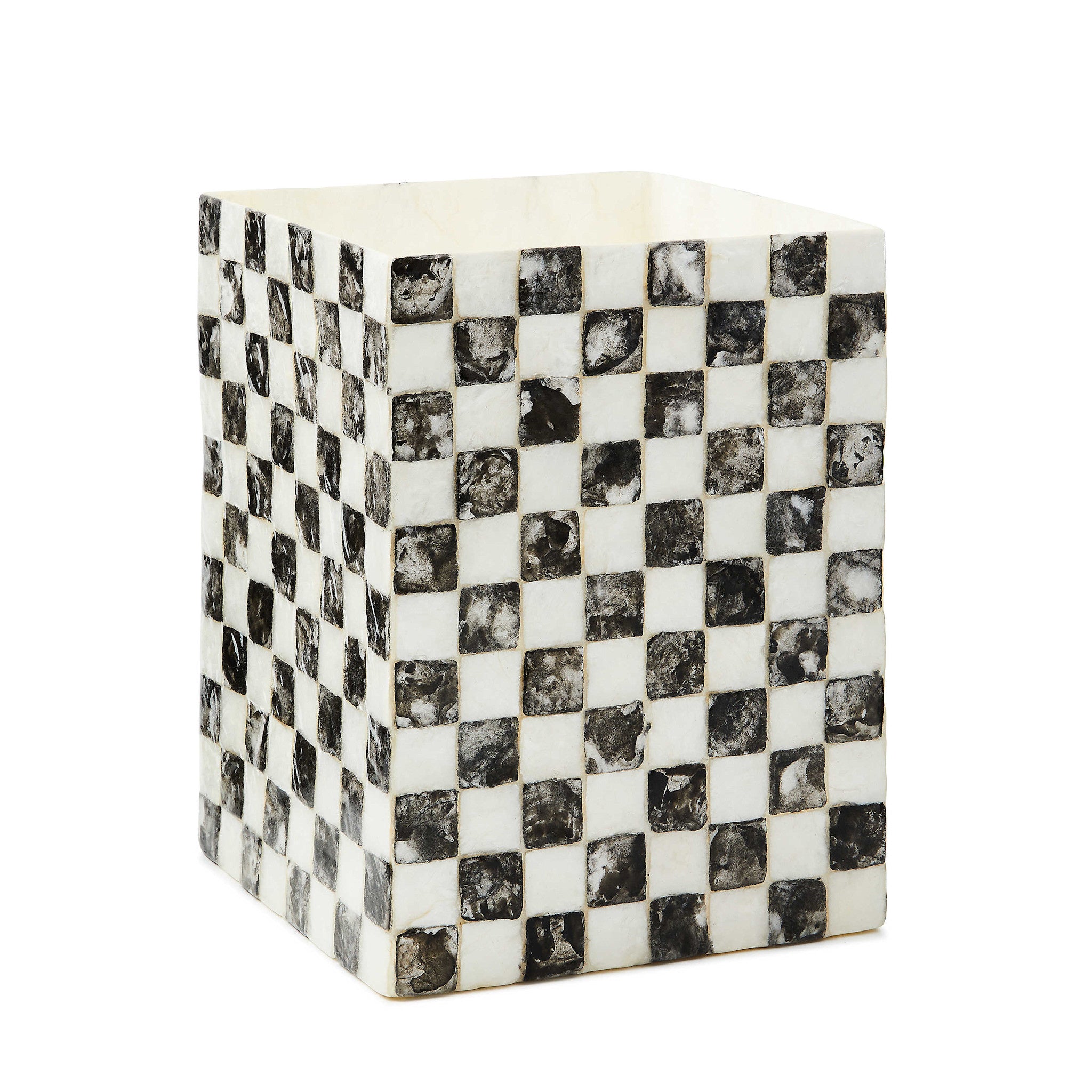 Dress up discards with the Courtly Check Capiz Waste Bin. It’s decorated with an inlaid pattern of signature checks on capiz.