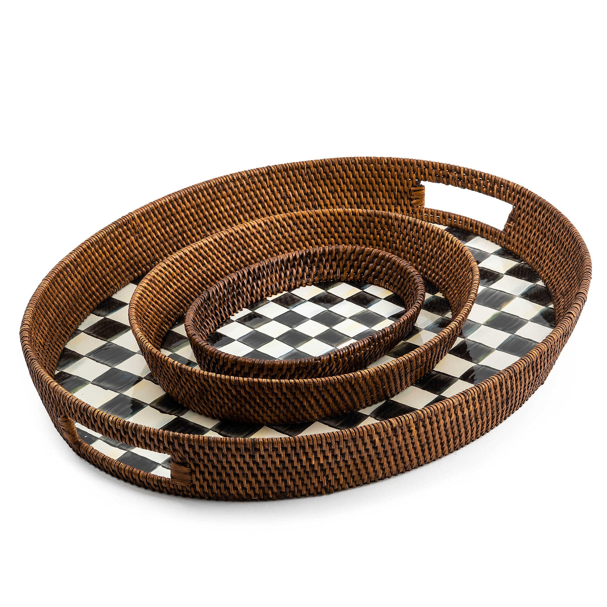 - Materials: Heavy-gauge, hand-glazed steel tray base with hand-painted Courtly Checks, rimmed in woven rattan. Pieces may vary due to the handmade nature of each product. Imported.