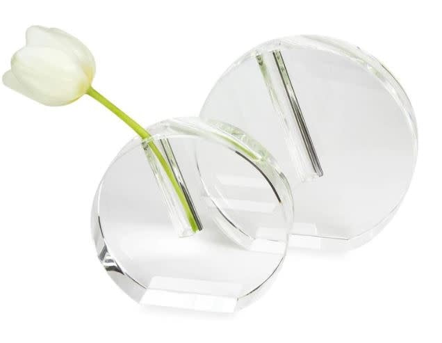 The Crystal Glass Bud Vase - Round Flat is modern with a clean design making it a great addition to any decor. Add this vase to your tabletop or home decor.