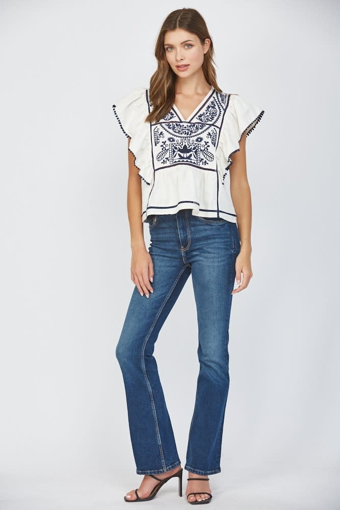 A charming blouse featuring delicate lace inserts, intricate embroidery, and flutter sleeves. Lightweight and stylish, perfect for adding a feminine touch to both casual and dressy looks.