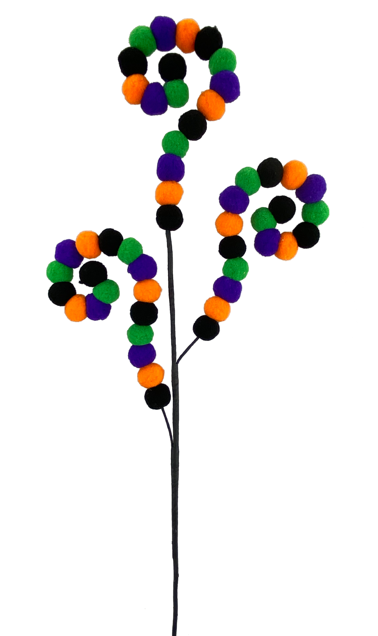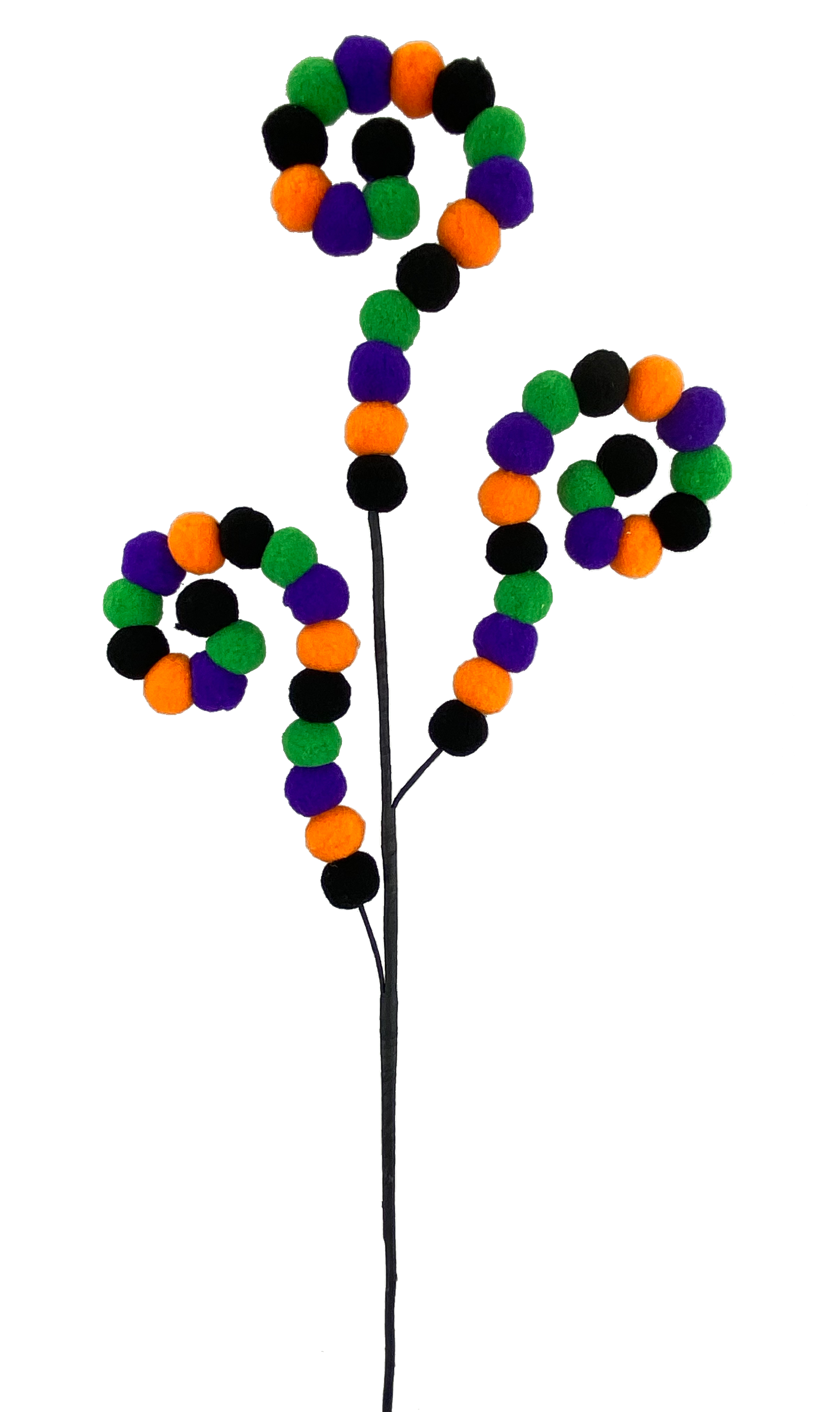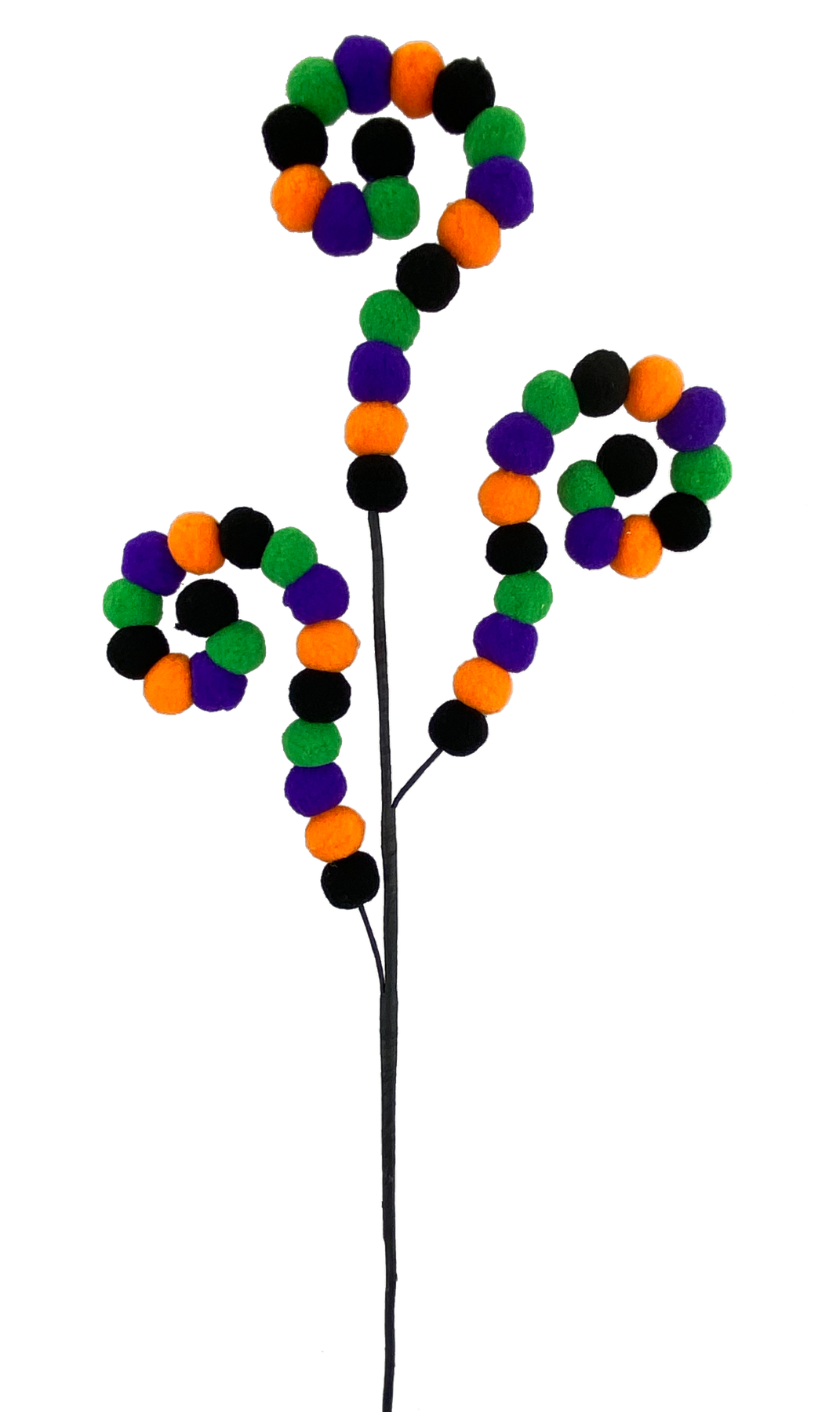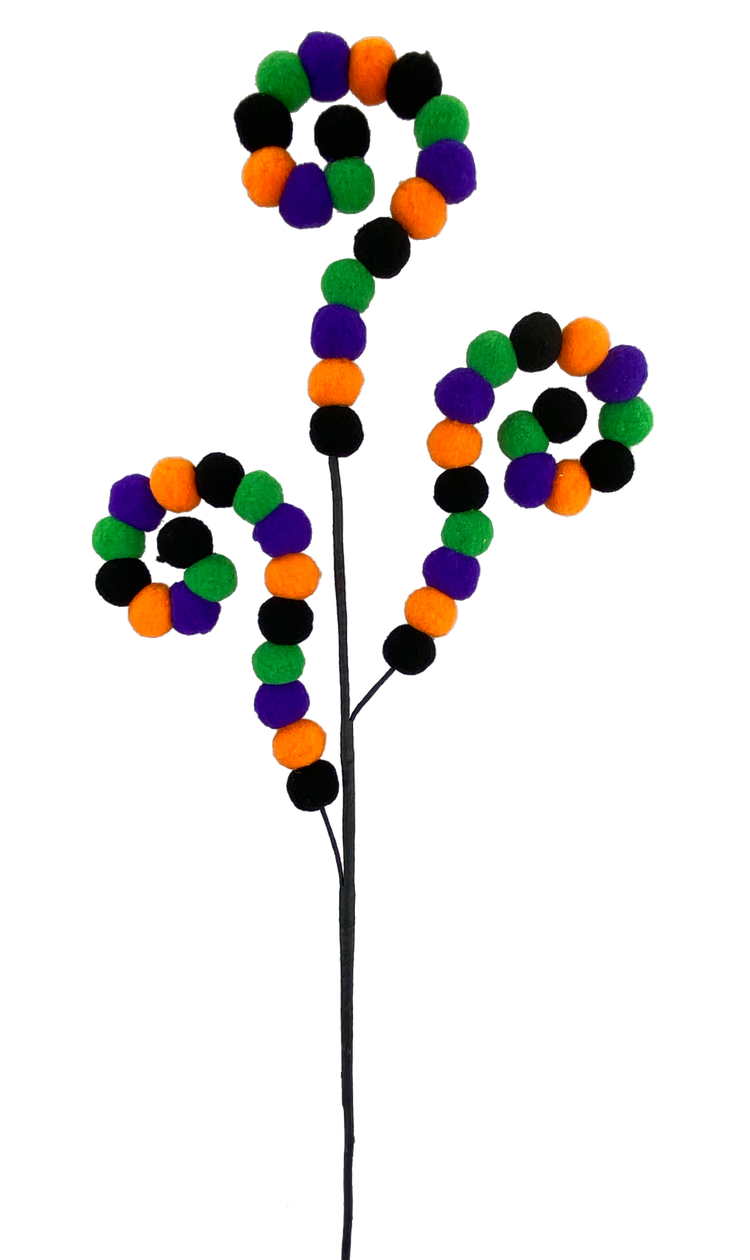 Three wired arms thread alternating felt pompoms in the classic Halloween colors of orange, black, purple and green.  The wired arms can be curled or straightened.