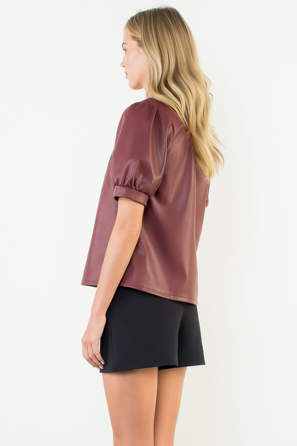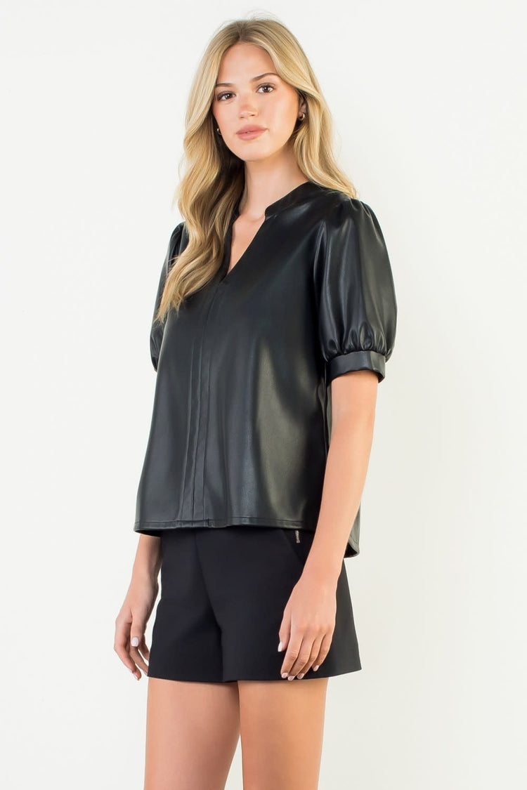 Bold and sophisticated, this black leather top features statement puff sleeves for a modern, structured silhouette. Perfect for elevating both day and night looks.