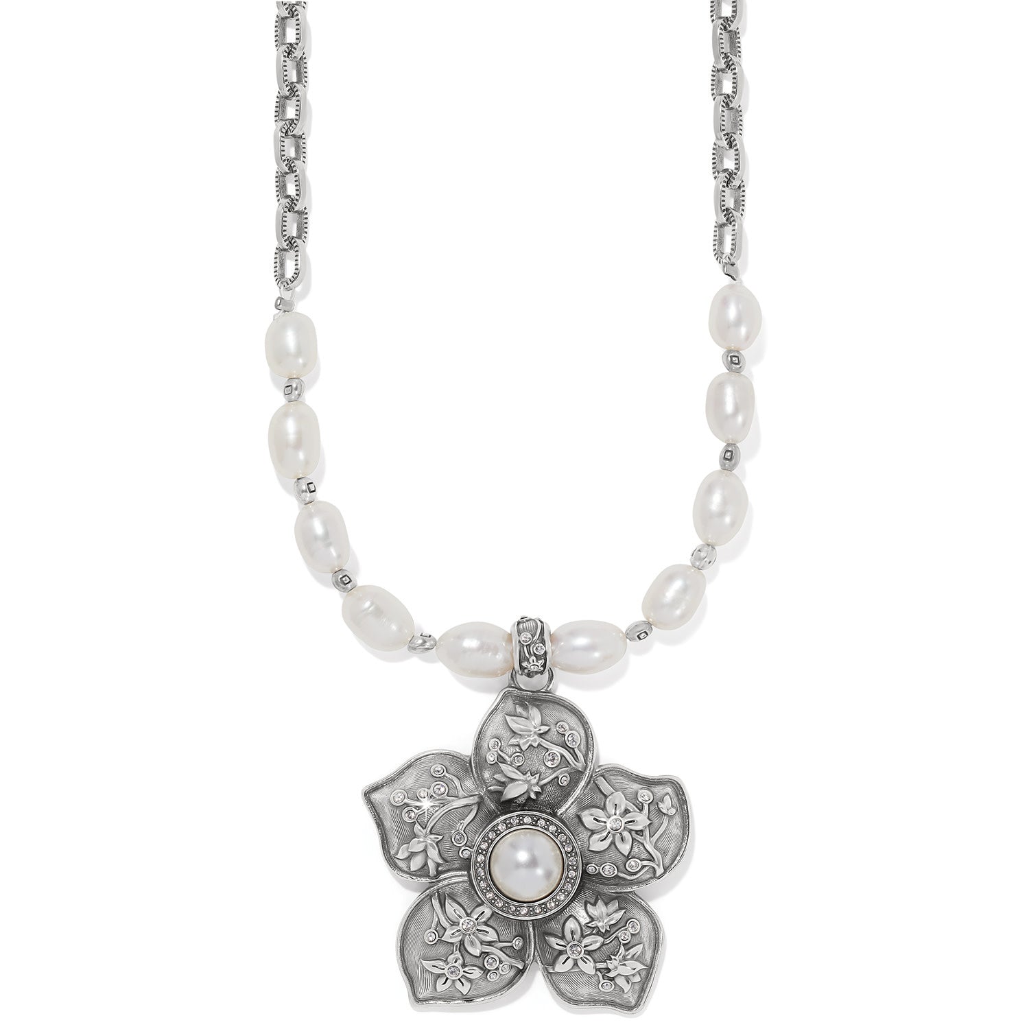 Inspired by designer’s trip to Kyoto, Japan – the imperial palace, temples, beautiful gardens and traditional culture – this Sakura (cherry blossom) necklace features cherry blossoms and pearls. Both cherry blossoms and pearls are highly prized in Japan. Carved in relief, the cherry blossom pattern appears on dimensional silver and is accented by natural freshwater pearls.