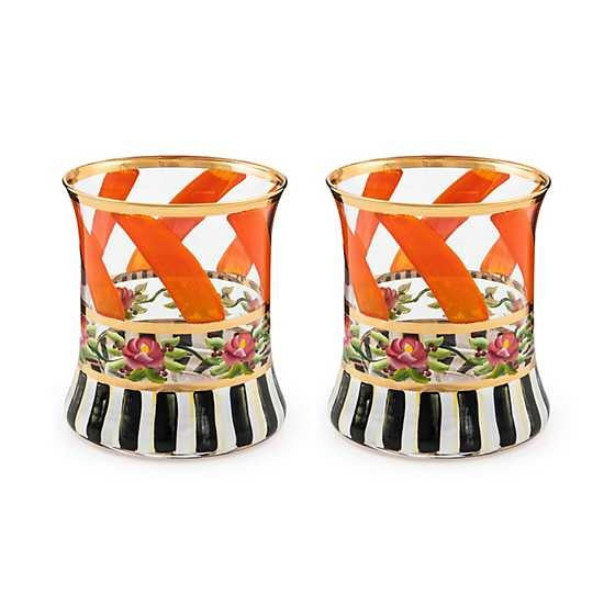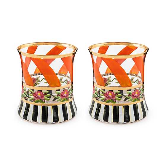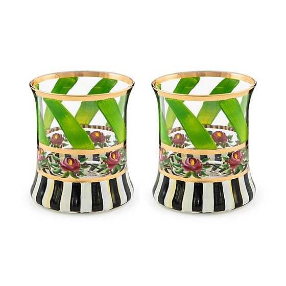Make any occasion more special by setting the table with this hand-painted, mouth-blown tumbler glass. Featuring a pattern of green ribbon swirls and pink roses on a base of Courtly Stripe, it’s trimmed with gold lustre.