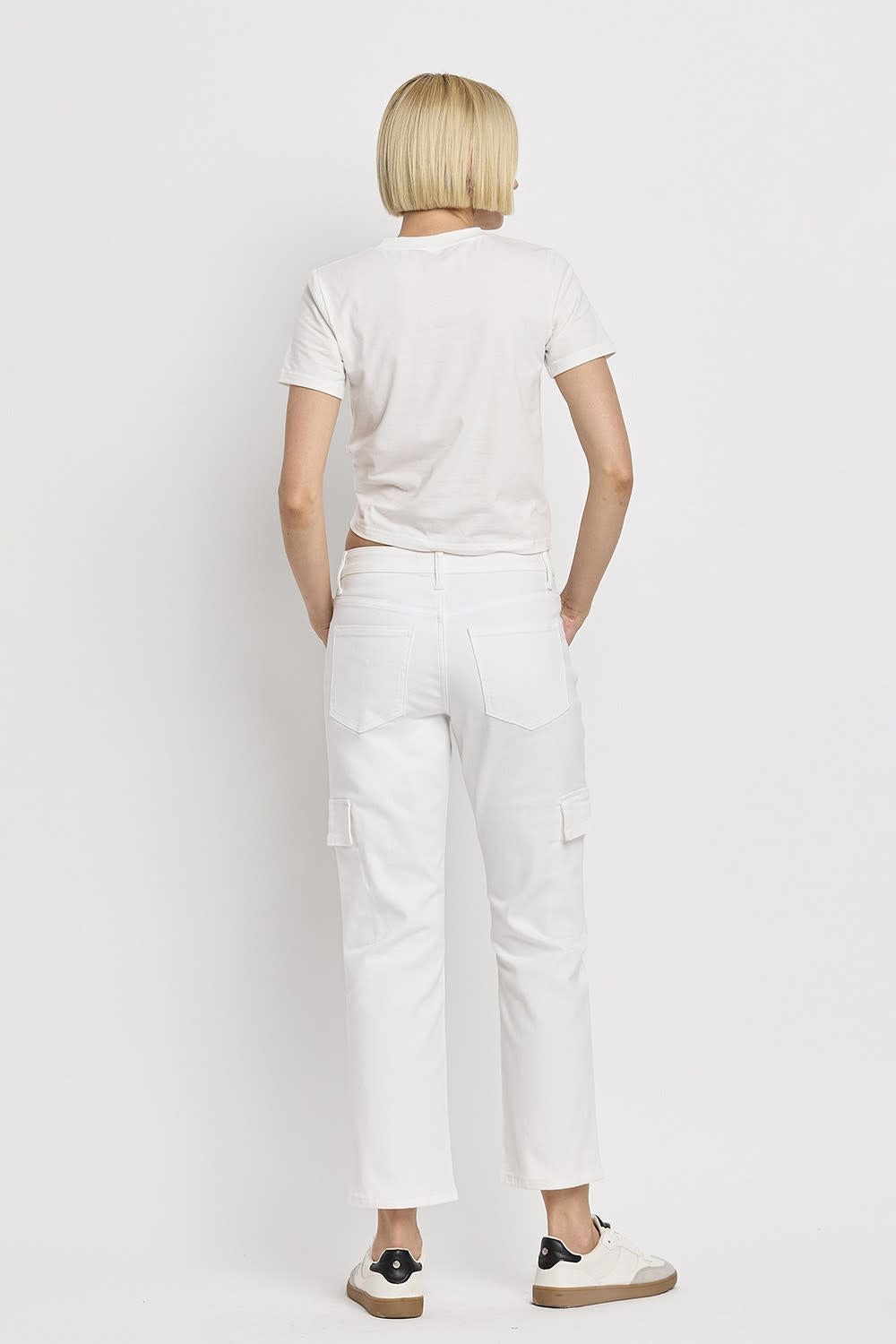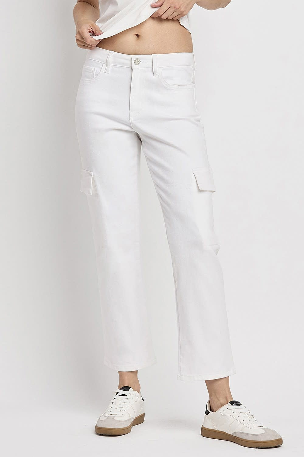 Stay on-trend with High Rise Crop Cargo Straight Jeans! Featuring a flattering high waist, cropped length, and cargo pockets, they combine style and comfort for a chic, casual look.