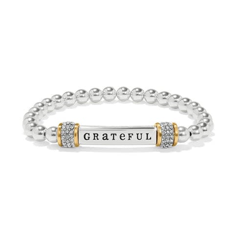This delicately styled, comfortable, and versatile two-tone stretch bracelet sends an inspiring message of gratitude to the world every day.
