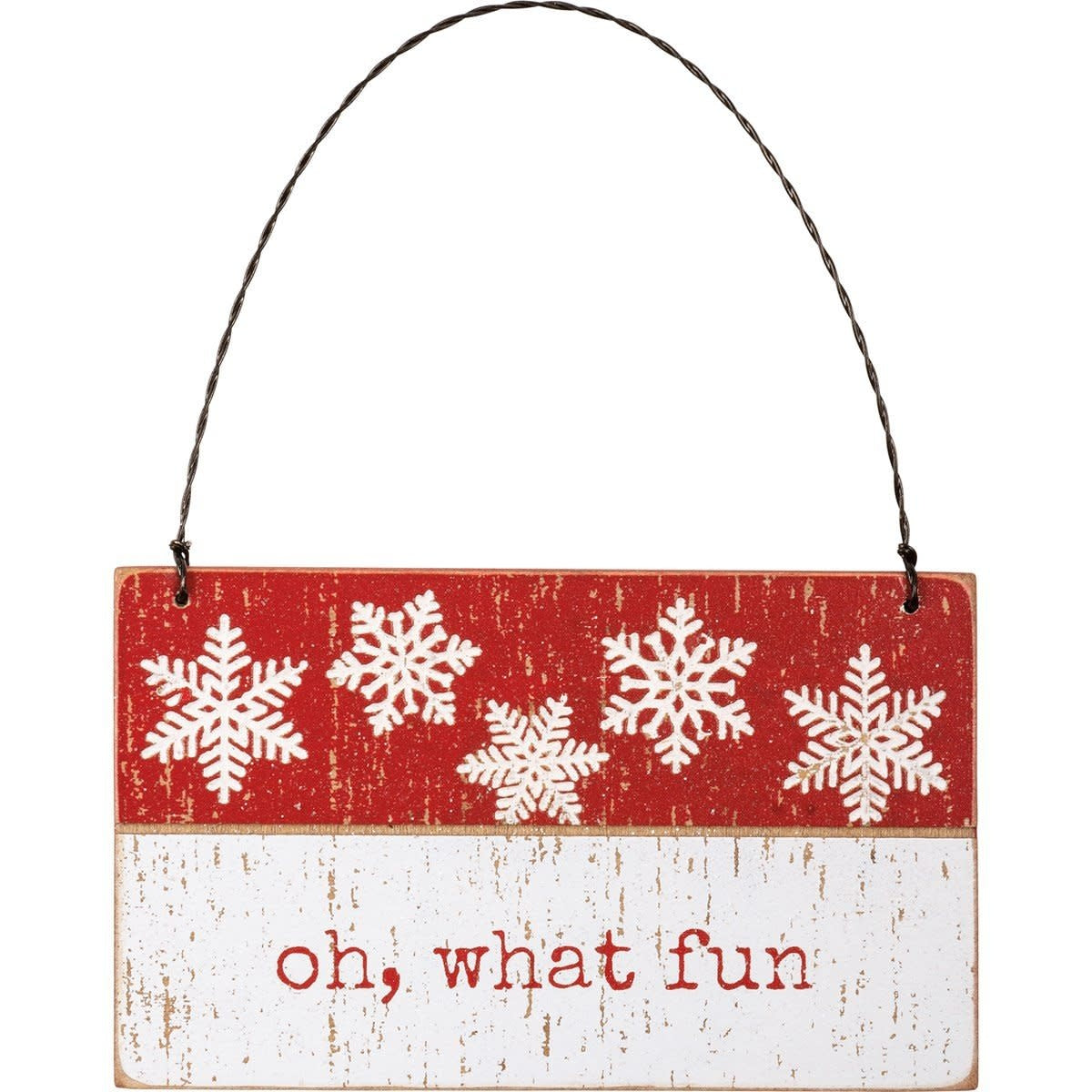 A rustic slat wood Christmas ornament featuring a typeset "Oh, What Fun" sentiment with debossed snowflake designs. Our What Fun Christmas ornament easily hangs by twisted wire loop.