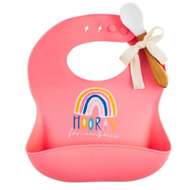 The two-piece set comes with a soft silicone pocket bib. The bib features a pink background with the phrasing "Hooray for rainbows". The set comes with a white wood and silicone spoon tied to the front of it, perfect for gifting!