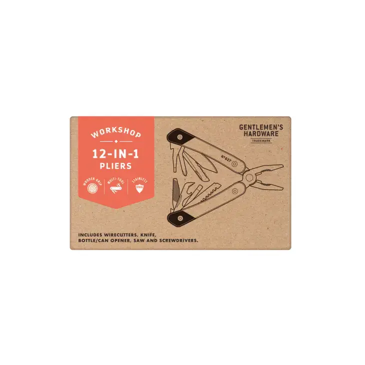 12-in-1 Plier Multi-Tool with wooden handle. Includes 12 stainless steel tools: needlenose and regular pliers, saw, can/bottle opener, wood/metal file, x2 screwdrivers and more. Titanium finish.