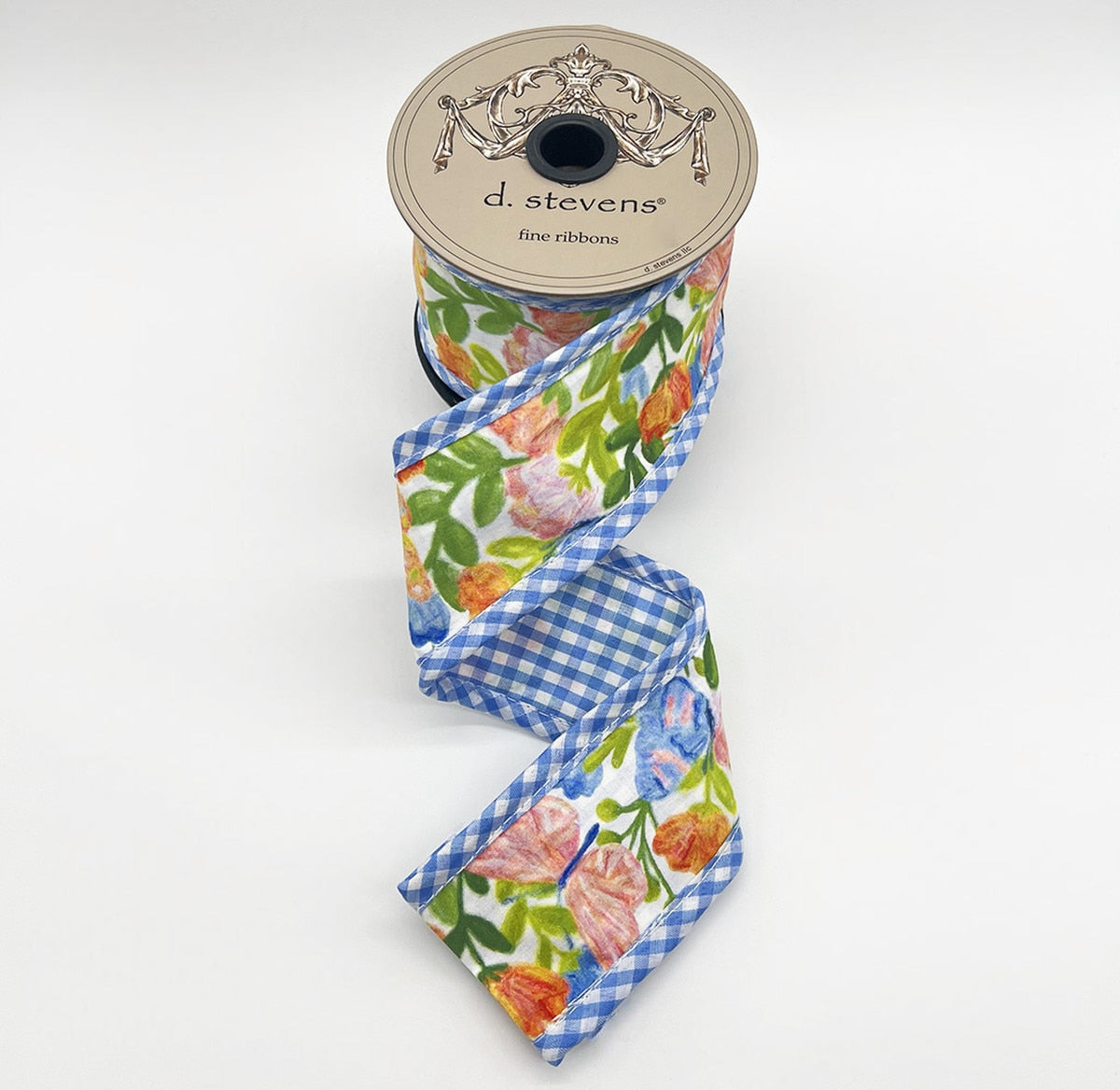 Poplin Mix Spring Floral Bow Blue Gingham Back, Green Pink Orange