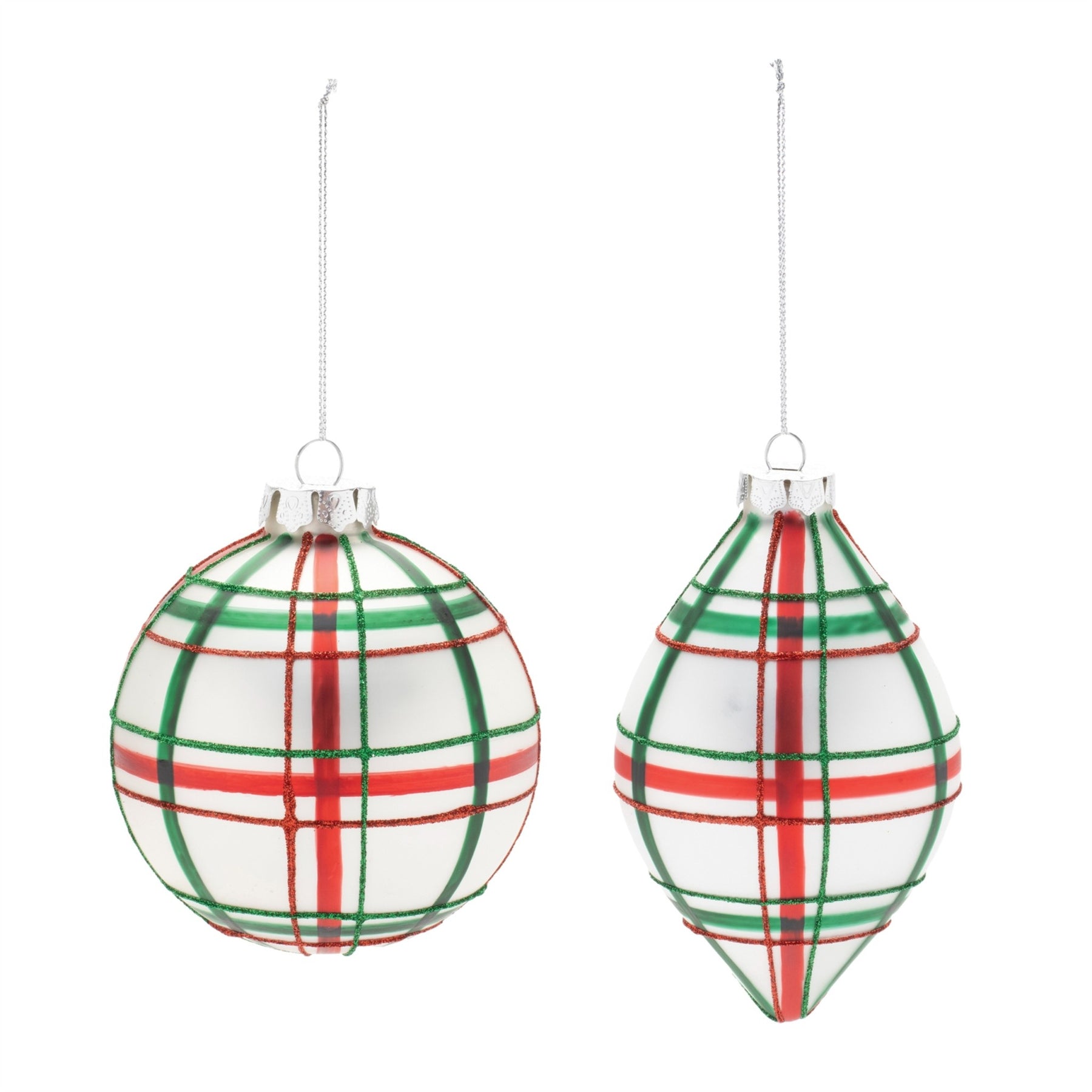 Add a festive touch to your holiday decor with Glass Ornaments. This set includes two assorted designs, each featuring a classic red and green plaid pattern. Perfect for adding charm and elegance to your Christmas tree, these ornaments are crafted from high-quality glass for lasting beauty.