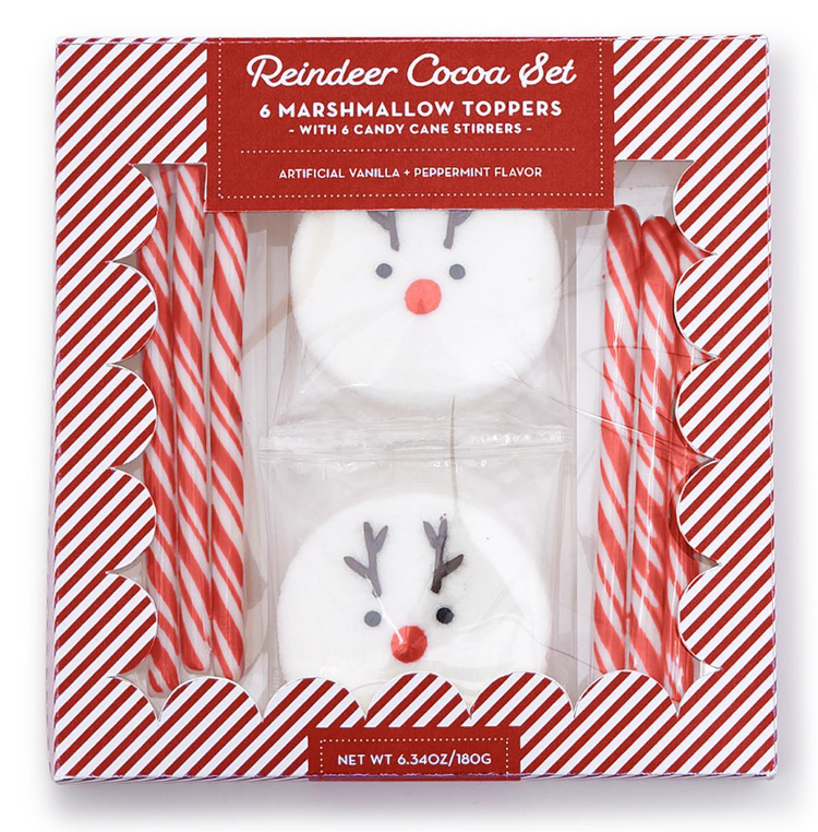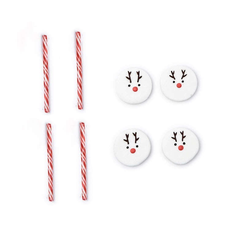 - Includes: 6 vanilla flavored reindeer marshmallow toppers and 6 pink candy cane stirrers