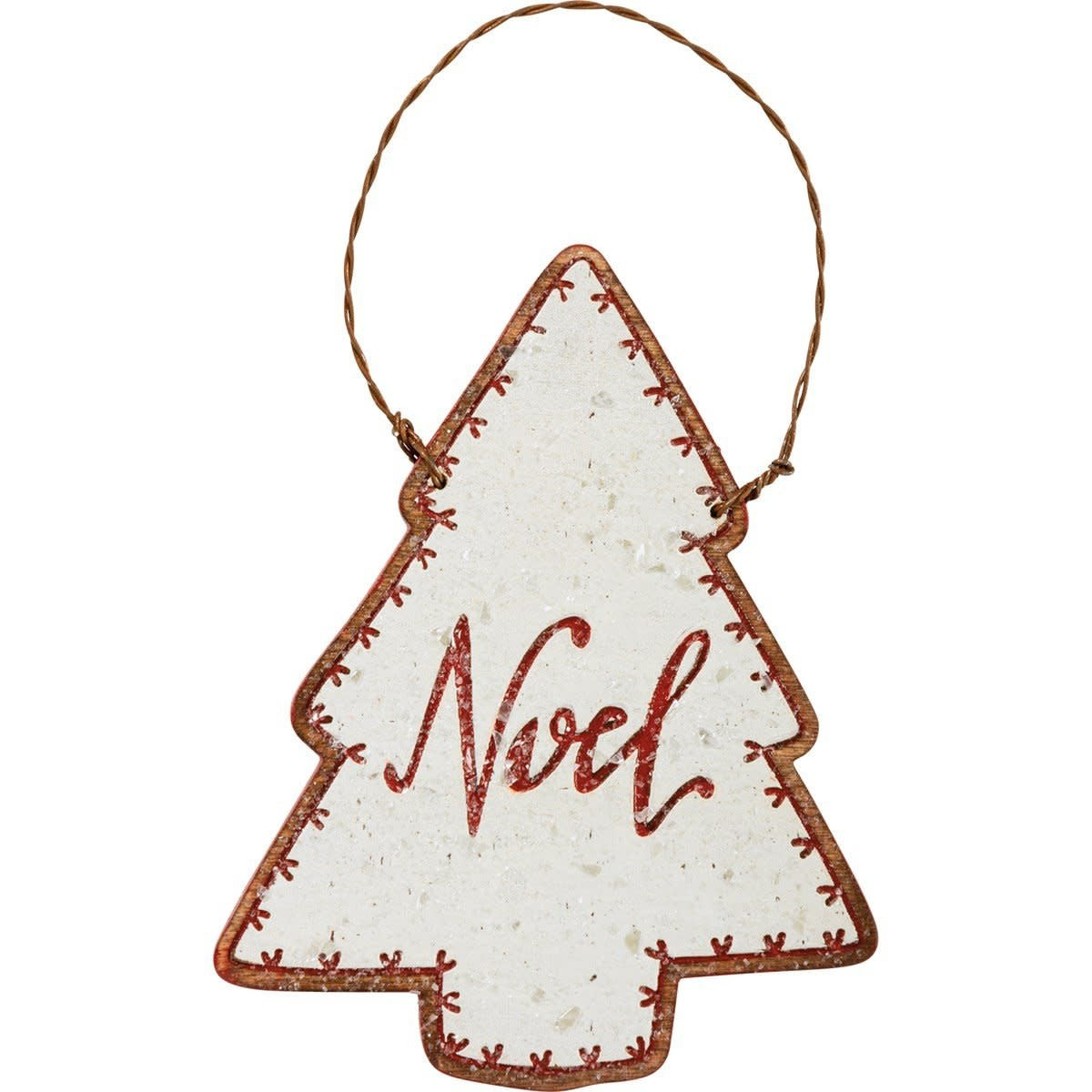A shaped wooden ornaments feature mice coating for a snowy effect, and twisted wire loops for easy hanging.