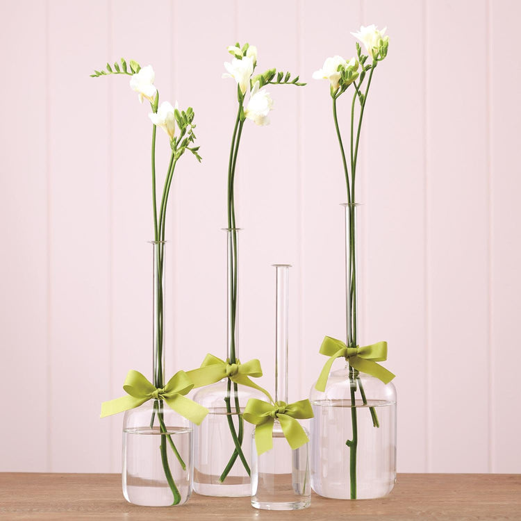 Like little gifts sprouting a flower or greenery, this design is made from hand-blown glass. Unlike traditional vases, the stunning designs feature a unique green ribbon detail that can be updated to fit any look or dècor.