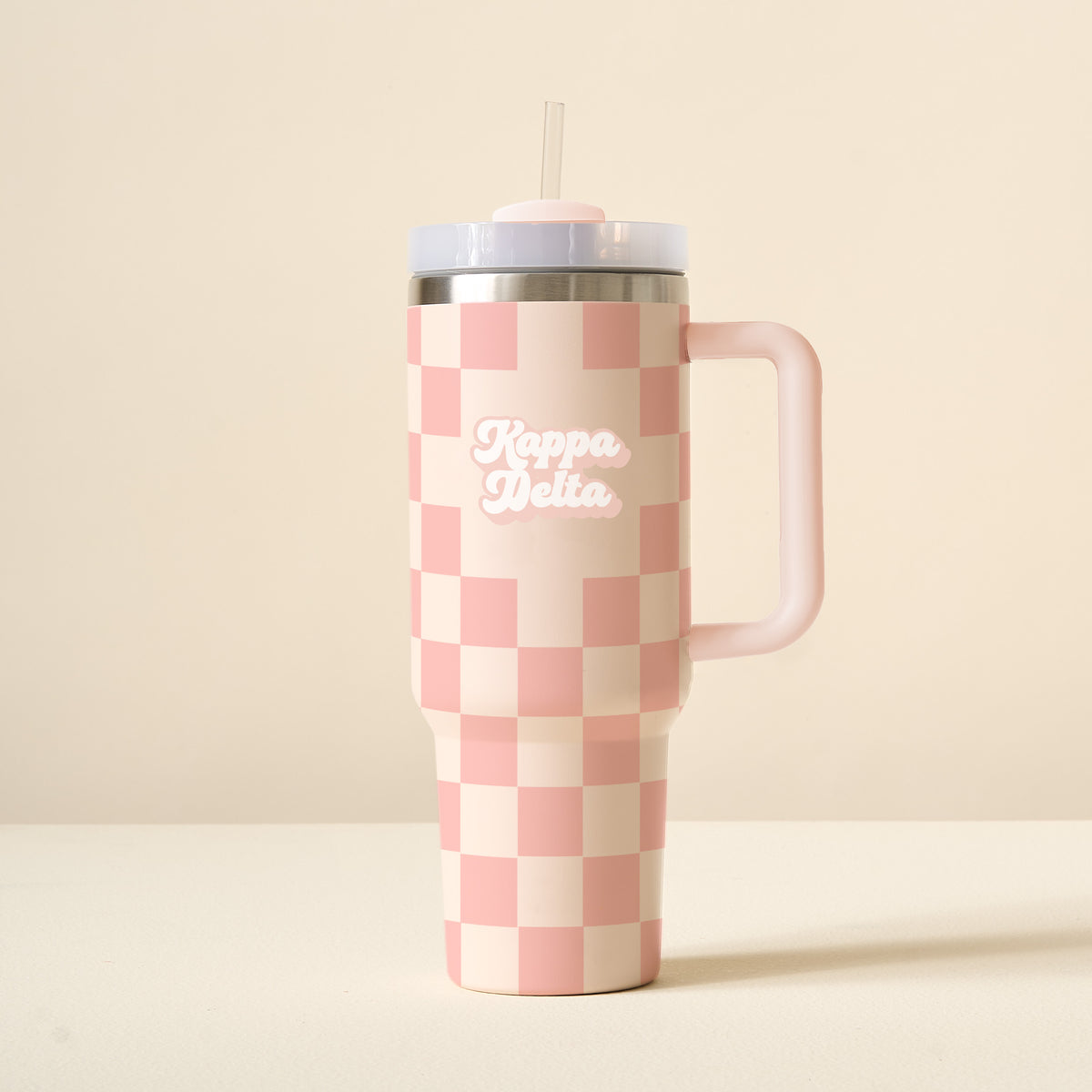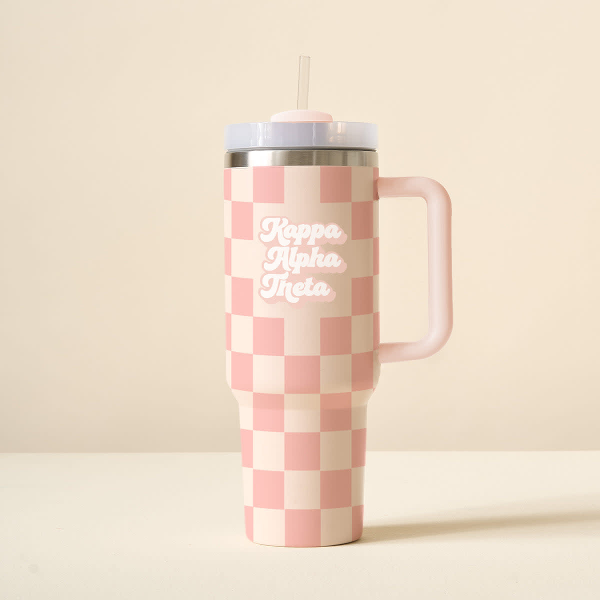 Designed for convenience, it includes a reusable straw and lid, is compatible with car cup holders, and offers a no-straw drink opening option. The triple-walled insulation keeps your drinks cold for hours, while the durable handle makes it easy to carry. This tumbler is the perfect, adorable companion for your busy sorority life!