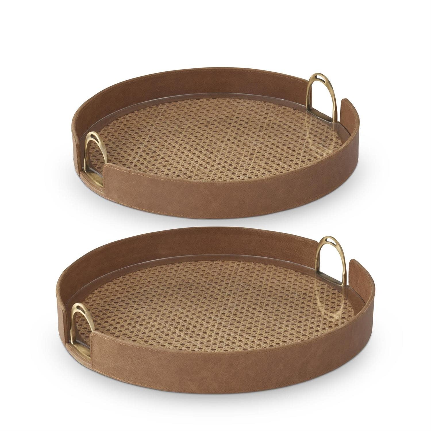Add timeless charm with this Tan Leather & Cane Tray featuring elegant stirrup handles. Perfect for serving or display, it blends rustic texture with sophisticated design.