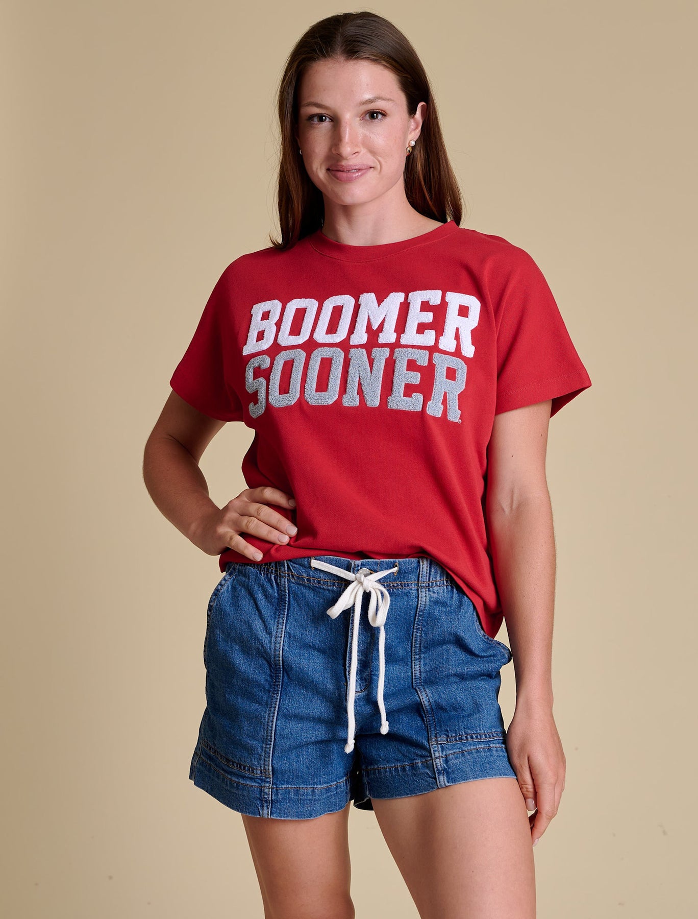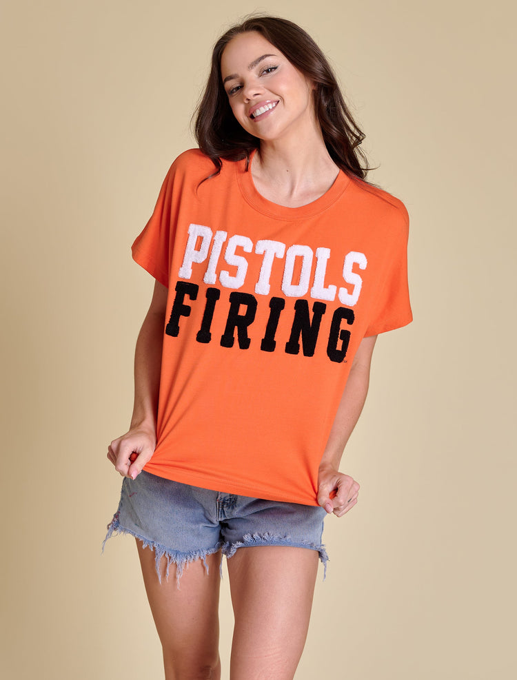 This relaxed-fit tee features ultra-soft French terry fabric and bold chenille varsity lettering for a spirited, vintage-inspired look. Its boxy cut offers a flattering, easy-to-layer fit—perfect for game day, tailgates, or showing off your team pride anytime.
