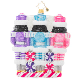 A trio of nutcrackers smile dutifully from their posts, dressed in uniforms of wintry pastels. Someone's got to guard the North Pole candy stash, and three heads are better than one!