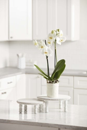 These classic white beaded pedestal trays are great for displaying springtime flowers. The tray features white wood with beaded rims. This tray can also be used to display food or party favors.