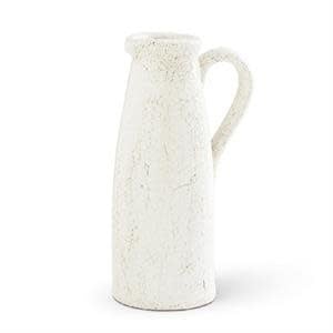 These distressed, ceramic pitchers are designed with an old world charm. Each vase is unique with its own crackle glaze.