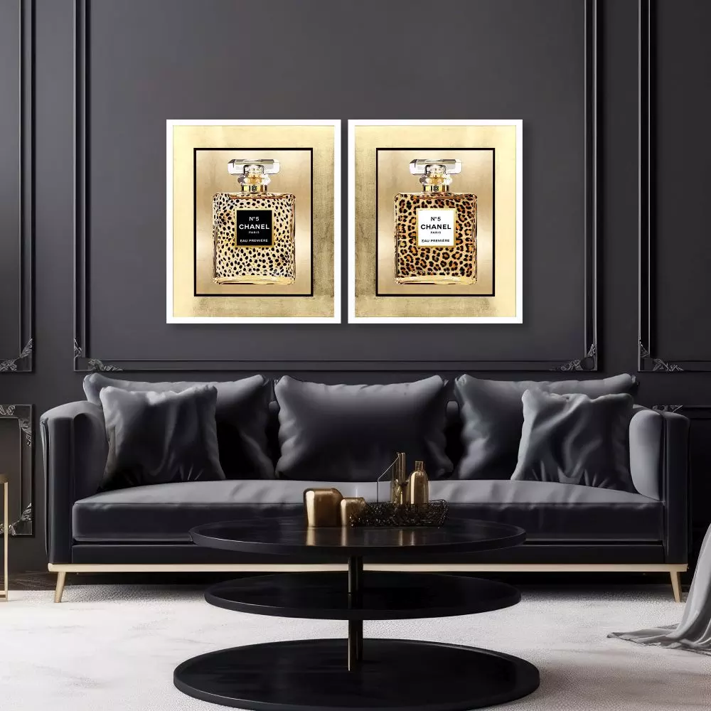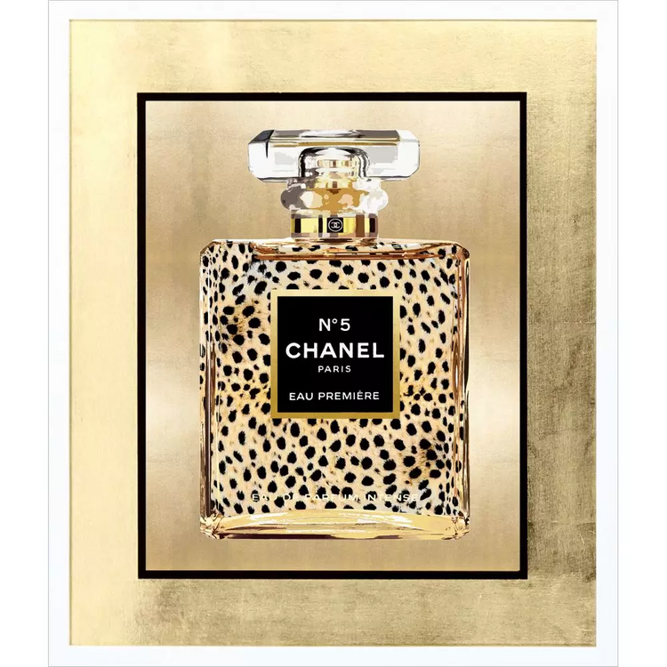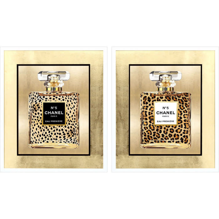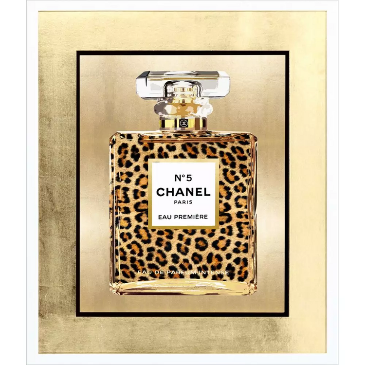 Animal prints pair with hand applied gold leaf matting for an exotic boudoir look. Framed in a lacquered white wood shadow box style moulding.