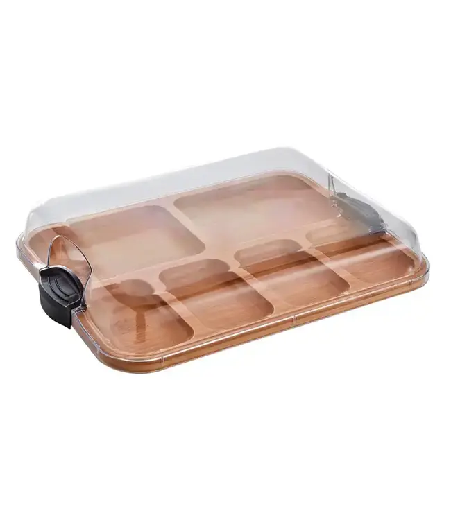 Craft stunning charcuterie arrangements using the Built-In Compartments, allowing you to arrange cheeses, fruits, nuts, or meats for an exquisite touch. Fill each compartment with your chosen ingredients to create an array of customizable arrangements, designed with on-the-go convenience in mind to ensure every ingredient stays secure during travel, whether it's a picnic or a friend's house. The practical locking plastic storage lid provides food freshness and security, making transporting your charcuterie board effortless. Ideal for gifting on various occasions, including weddings, newlyweds, hostess gifts, or housewarming presents, the "Build a Board" combines sophistication and utility for every celebration. Its dual-sided design provides dual functionality.
