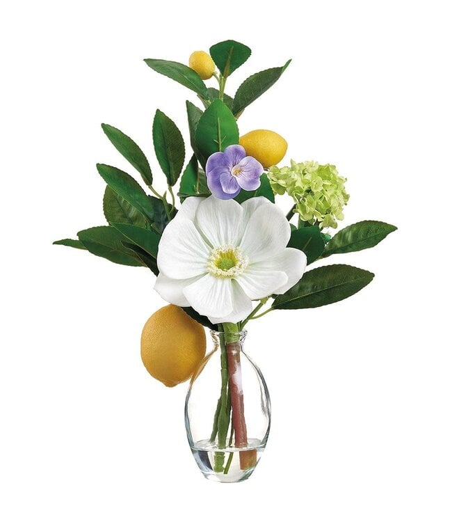Stunningly beautiful, this 13" Anemone, Snowball & Lemon Silk Flower Arrangement with Glass Vase resembles that fresh cut flowers look and includes the shown glass vase.