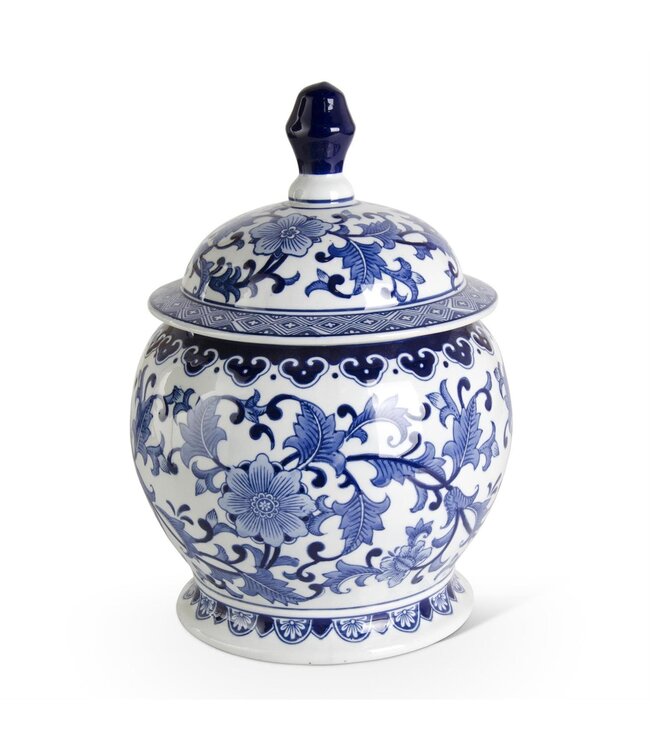 Beautifully crafted ceramic jar with lid features beautiful blue and white patterns.