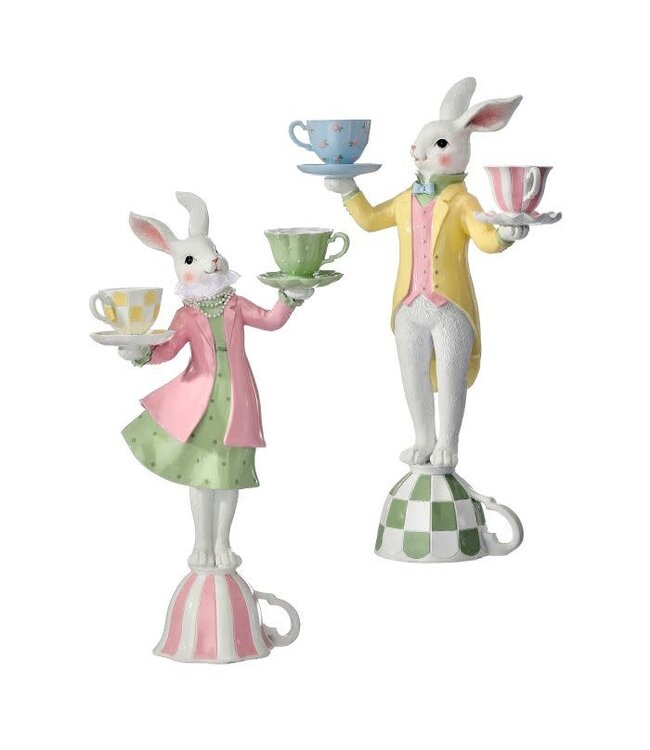Add a whimsical touch to your seasonal décor with this set of two 16-inch Resin Bunnies with Teacups. Each bunny is crafted from durable resin and delicately holds a miniature teacup, creating a charming and playful display. SOLD INDIVIDUALLY