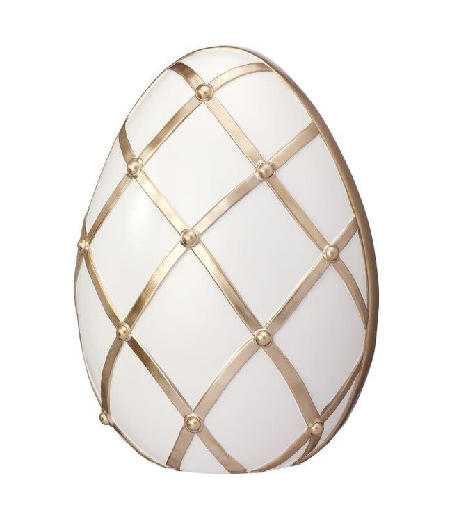 Celebrate the season in style with this 16.25-inch Resin Lattice White Chocolate Egg. Featuring an elegant textured gold lattice design over a creamy white base, this decorative egg exudes sophistication and festive charm.
