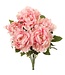 This luxurious Peony Bush features a large cluster of five open, layered blossoms and one bud, all surrounded by rich, dark green foliage on branching stems. It is perfect for display in any home decor.