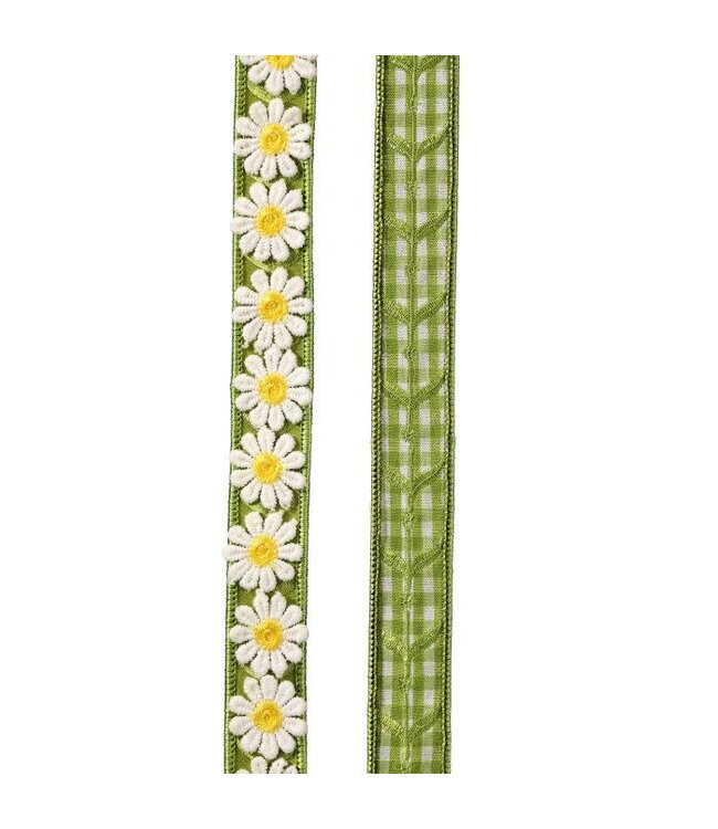 The Daisy/Gingham Ribbon is a delicate and high-quality decorative trim that offers two distinct, charming aesthetics in one piece.