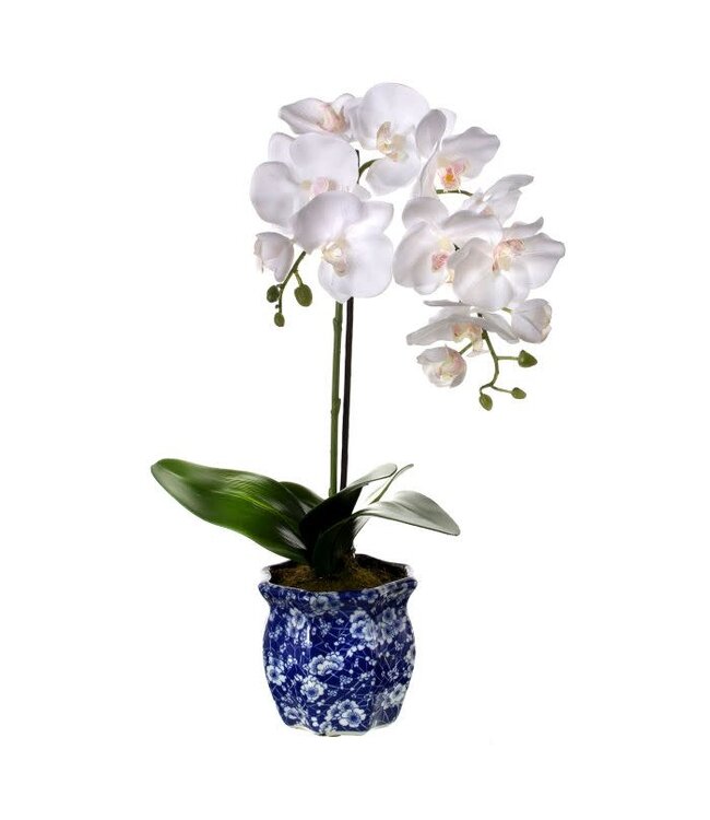 Add a touch of effortless elegance to your space with this high-quality artificial double Phalaenopsis arrangement. Set in a beautiful blue ceramic container, it offers lifelike beauty, lasting color, and zero maintenance for year-round style.