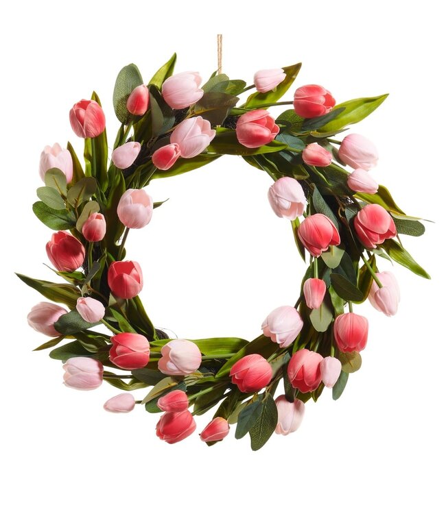 Add soft color and floral charm to your seasonal décor with the 22" Shades of Pink Tulip Spring Wreath. This beautiful wreath is perfect for hanging on a front door, wall, or mantel to create a welcoming display.