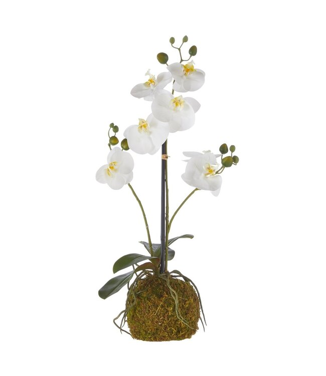 Lifelike and elegant, this Real Touch White Orchid features soft, natural-looking blooms paired with a lush moss ball base. A timeless accent that brings effortless beauty and freshness to any room—no maintenance required.