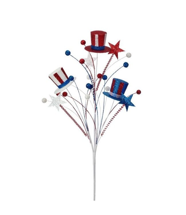 This Uncle Sam Glitter Hat Spray brings bold patriotic flair to seasonal arrangements with sparkling red, white, and blue accents. Featuring glittered top hats, stars, and decorative picks, it adds height, movement, and festive energy to containers, cente