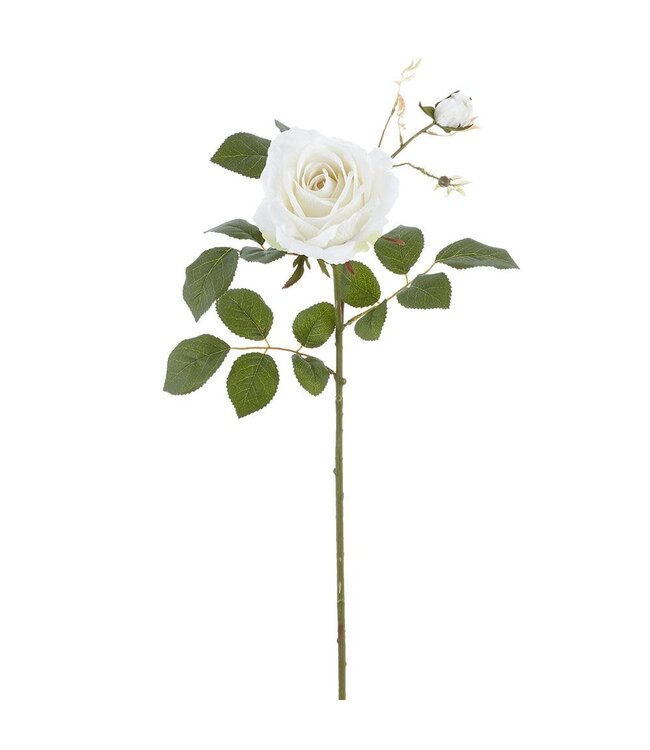 The classic Rose Spray features one open blossom and a single bud, surrounded by rich, lifelike compound foliage along a detailed stem. It is perfect for display in any home decor.