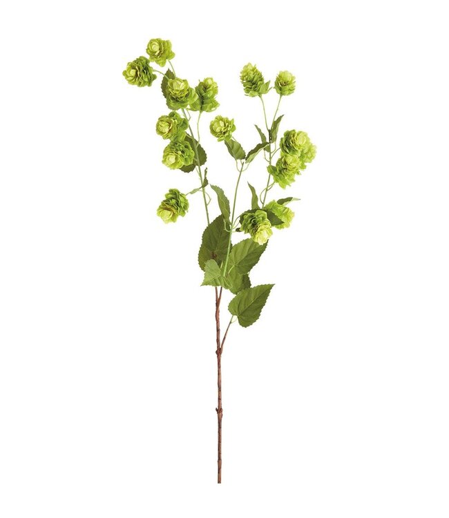 Hops Spray displays numerous textured, cone-shaped structures clustered along branching stems, interspersed with lobed foliage, providing a unique, rustic fullness. Read more.