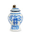 This wonderful decoration makes a gift for the collector of blue and white items or spice jars. It has a glossy off-white base color with two-tone blue details. The front and back have the same designs with lettering, and both sides have the same designs