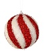 This adorable swirl candy ball ornament measures approximately 4.5 inches tall with bright red and white colors and features a sparkling accent on it.